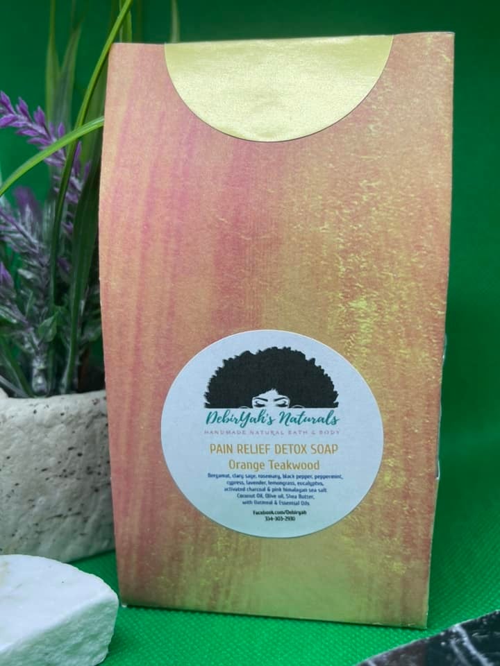 This soap contains 8 essential oils for pain relief. This includes pain relief associated with inflammation, muscle soreness, cramps, joint pain, & neuropathic pain. Lemongrass essential oil is known to gradually reduce arthritis pain over time. The aromatic benefits of these essential oils cal 7 relax the mind, aid in stress reduction, headaches, & improves breathing. Orange oil reduces dark spots & blemishes via Vitamin c, fights off free radicals to prevent premature skin aging, fights acne, boosts circulation, promotes cell growth & collagen synthesis, shrinks large pores & firms skin (Astringent). Its pleasant scent is uplifting, yet simultaneously relaxing, helps reduce pulse rate, stimulates the strength & resilience of immune system, & eliminates airborne bacteria. Teakwood essential oil is calming, relaxing, great for stress, & emotional balance. Pink Sea Salt has 84 trace minerals for the body, contains properties that heal & soothes skin by calming irritations & breakouts. Also helps retain moisture in the deeper layers of akin & offers long-lasting hydration.